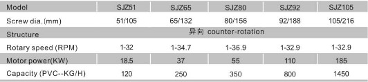 SJZ series conical twin-screw rxtruder has advantages such an forced extruding extruding, high quality,wide adaptability, long working lifr, low shearing seed, hard decomposition, good compounding & plasticization effect, and direct shaping of powder meterial and etc.